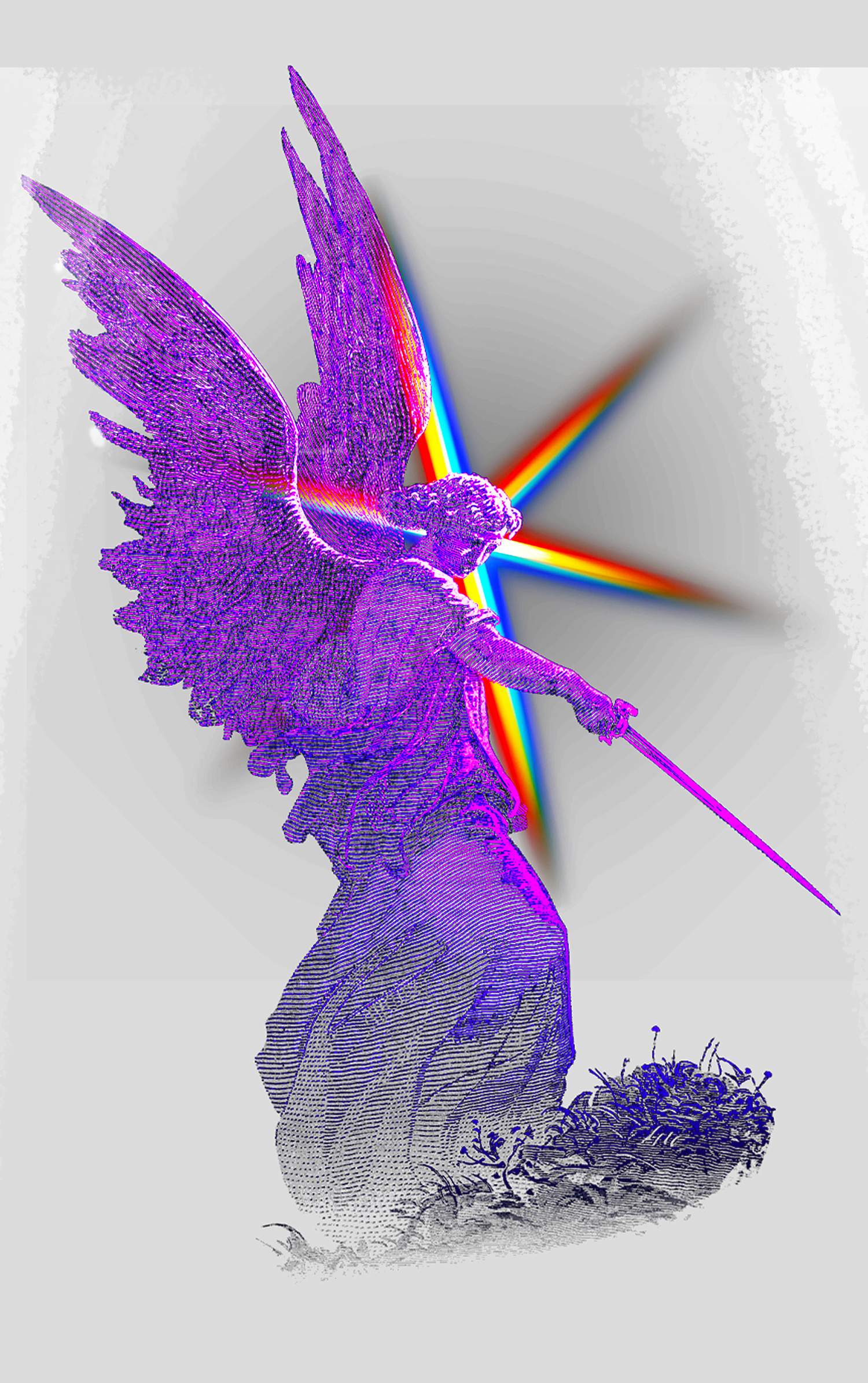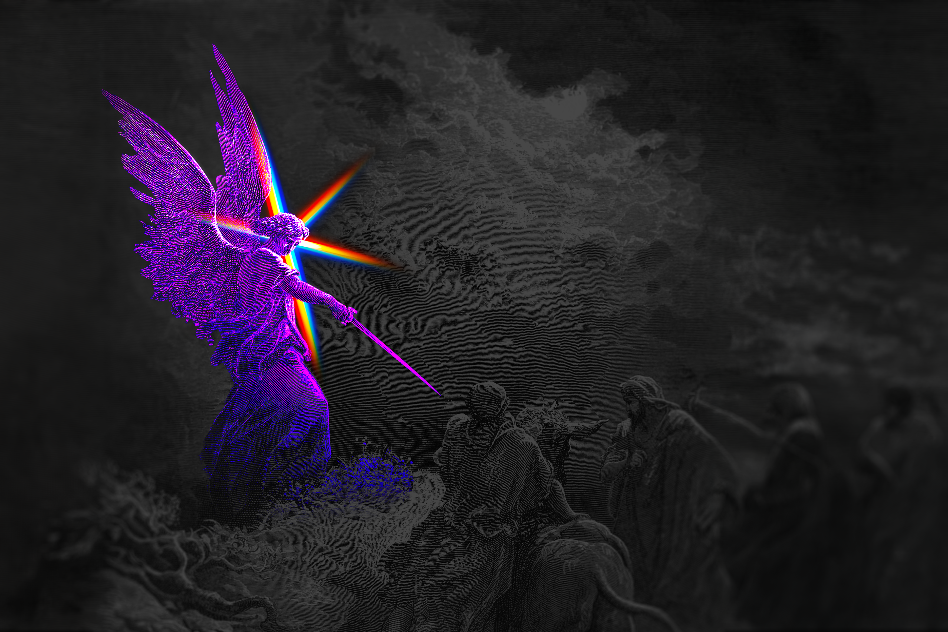 - Inspiré de la gravure de Gustave Doré, la scène mystique où l'ange se révèle à Balaam, avec une intensité visuelle saisissante. Le contraste puissant entre les ombres profondes et la lumière divine qui émane de l'ange crée une atmosphère dramatique et surnaturelle. Les lignes nettes et les détails minutieux caractéristiques de Doré sont réinterprétés de manière audacieuse, avec des éléments graphiques modernes et dynamiques.